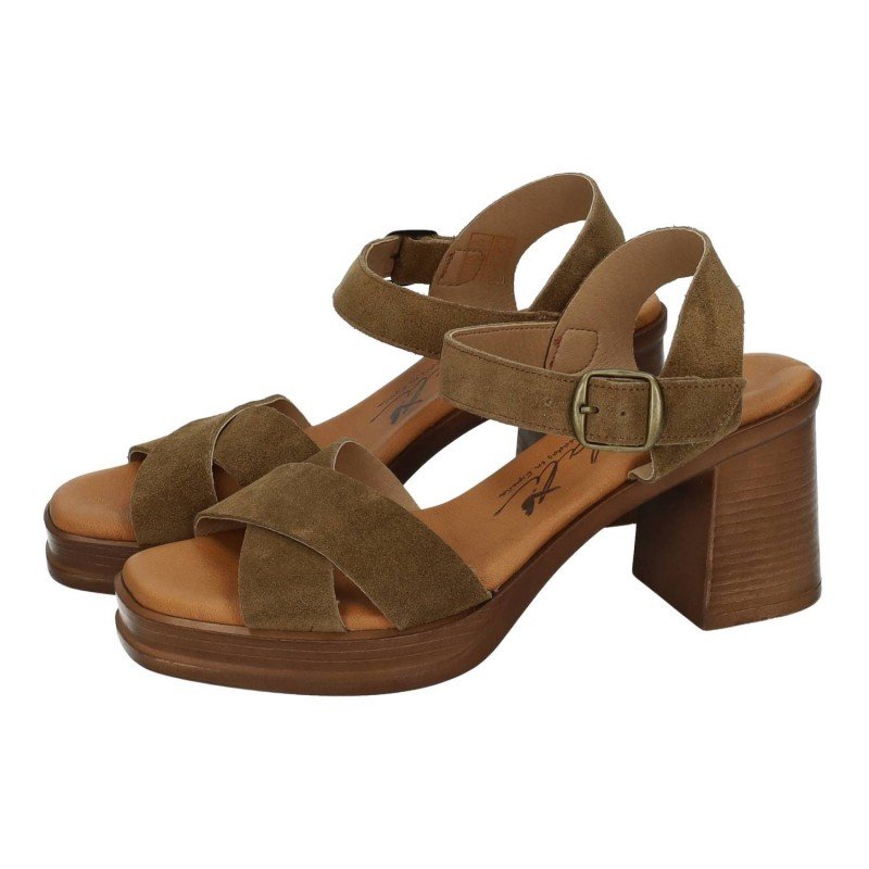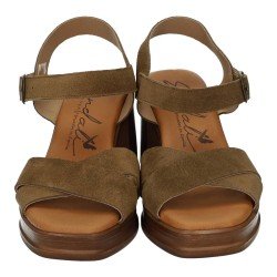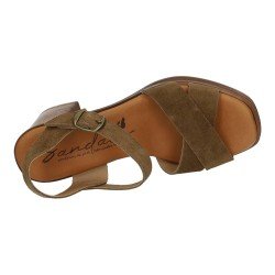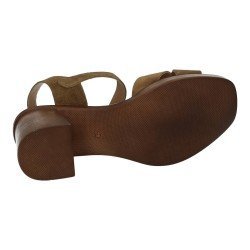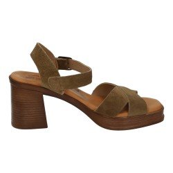 Estas sandalias de tacón para mujer de la marca SANDALI destacan por su diseño actual y su confección en piel serraje color kaki, ideal para combinar con tus looks veraniegos más naturales.