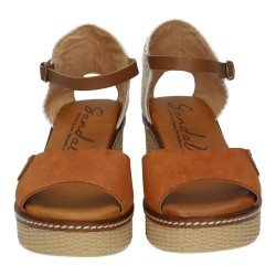 La cuña forrada en material trenzado tipo yute estiliza la figura y aporta altura con estabilidad, mientras que el cierre con pulsera y hebilla metálica garantiza un ajuste seguro al tobillo.