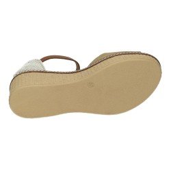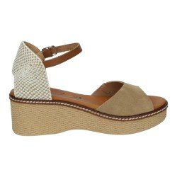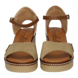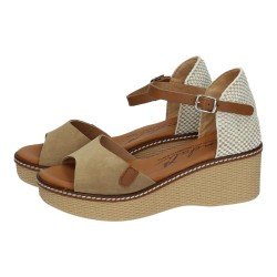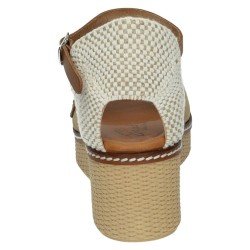 Estas sandalias con cuña color arena de piel de la marca SANDALI son ideales para quienes buscan un look natural y elegante en los días de calor. Su diseño combina piel suave en tono arena con una cuña de textura trenzada que aporta un estilo veraniego y fresco.