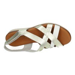 Este calzado abierto bicolor en piel (plata + blanco) está pensado para el día a día: la plantilla acolchada suaviza la pisada y mejora la sensación de descanso al caminar.