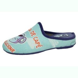 Zapatillas de casa para mujer, en color celeste con diseño taza de café, con borde y piso de goma en color lila. Suaves, cómodas, con puntera cerrada. Fabricadas en España por SANDALI.