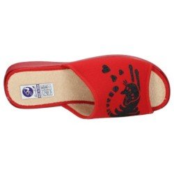 Zapatillas de estar en casa para mujer, en color rojo con un bonito diseño de gato. Suaves, cómodas, frescas y ligeras, con un poco de cuña, ideales para el verano. Fabricadas en España por SANDALI.